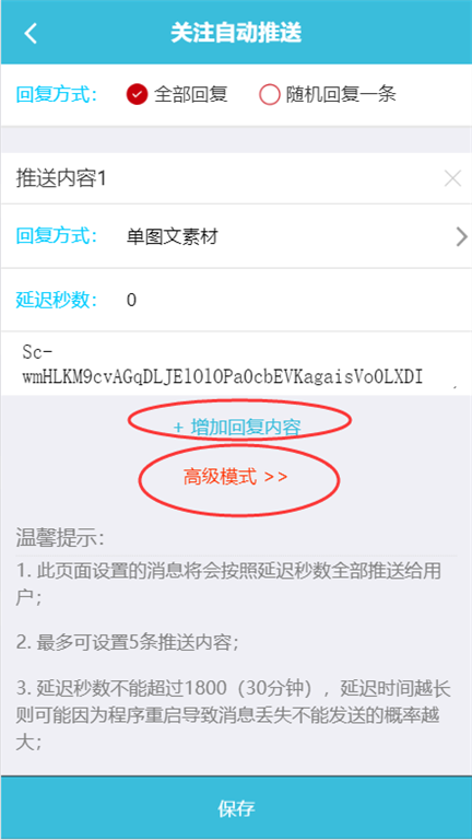 5、自动推送的多条消息可设置部分必定回复,部分随机回复;