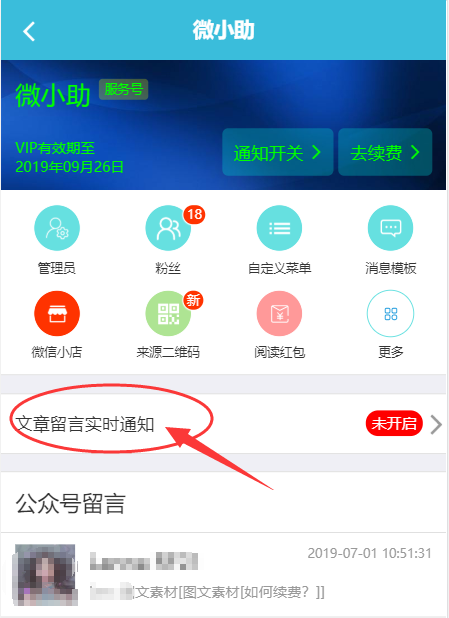 在接下来的页面中,点击已授权的公众号名称,然后进入公众号管理主页面。然后点击【文章留言实时通知】一栏,如下图所示:
