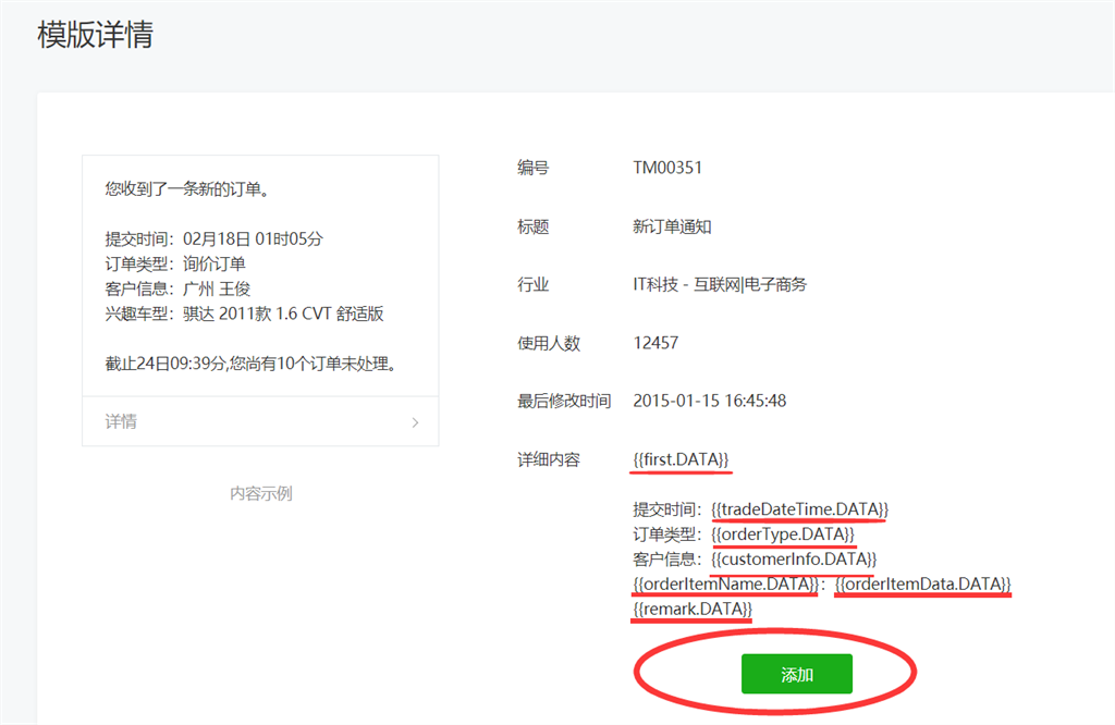 比如我们选择TM00351(新订单通知)那个模板,点击详情。出现如下界面: